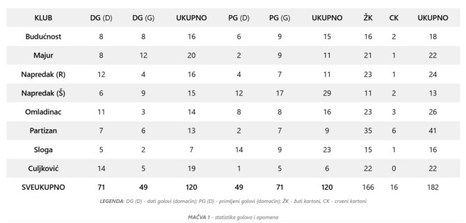 Kao što se videlo po broju golova na njihovim mečevima, Napredak (Š) igra otvoreno što je rezultiralo time da su jedina ekipa koja je postigla gol svakom protivniku. Iza njega su Culjković, Majur i Budućnost, koji samo na jednoj utakmici nisu uspeli da postignu gol.