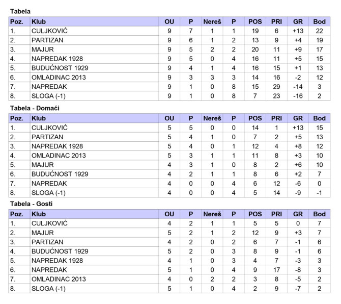 | 7 | Napredak (Š) | 9 | 1 | 0 | 8 | 3 | |